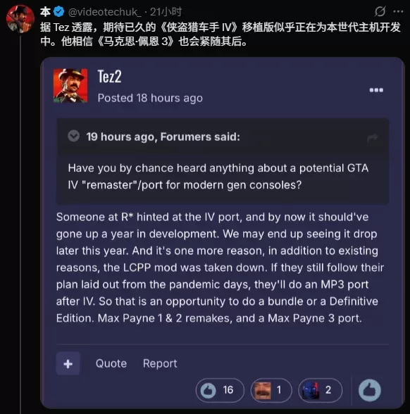 泄密者 Tez2 表示,该游戏的升级版已经开发了一年多。