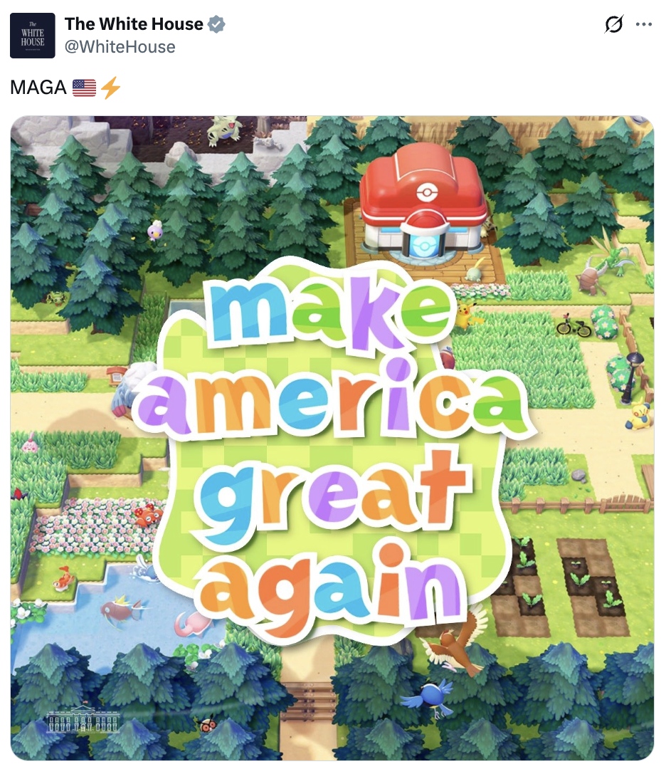 3月5日,美国白宫在未获得宝可梦公司授权的情况下, 在社交媒体上发布了一张使用宝可梦Pokopia封面爆改的图片,并配文”MAGA”(Make America Great Again)。