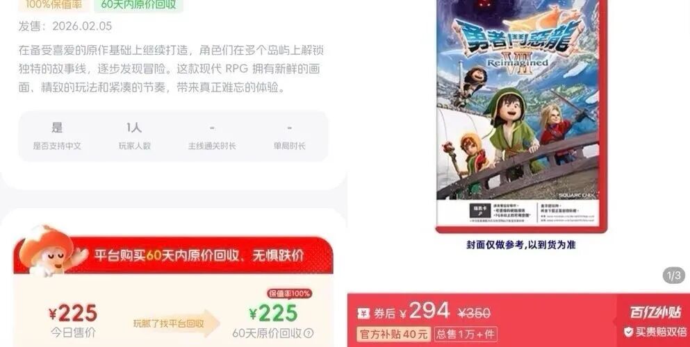 拿刚上架不久的NS2游戏《勇者斗恶龙7重制版》来说,蘑菇时间的二手卡带价格只要225元,而拼多多百亿补贴还要294元,价格优势直接拉开将近70块。