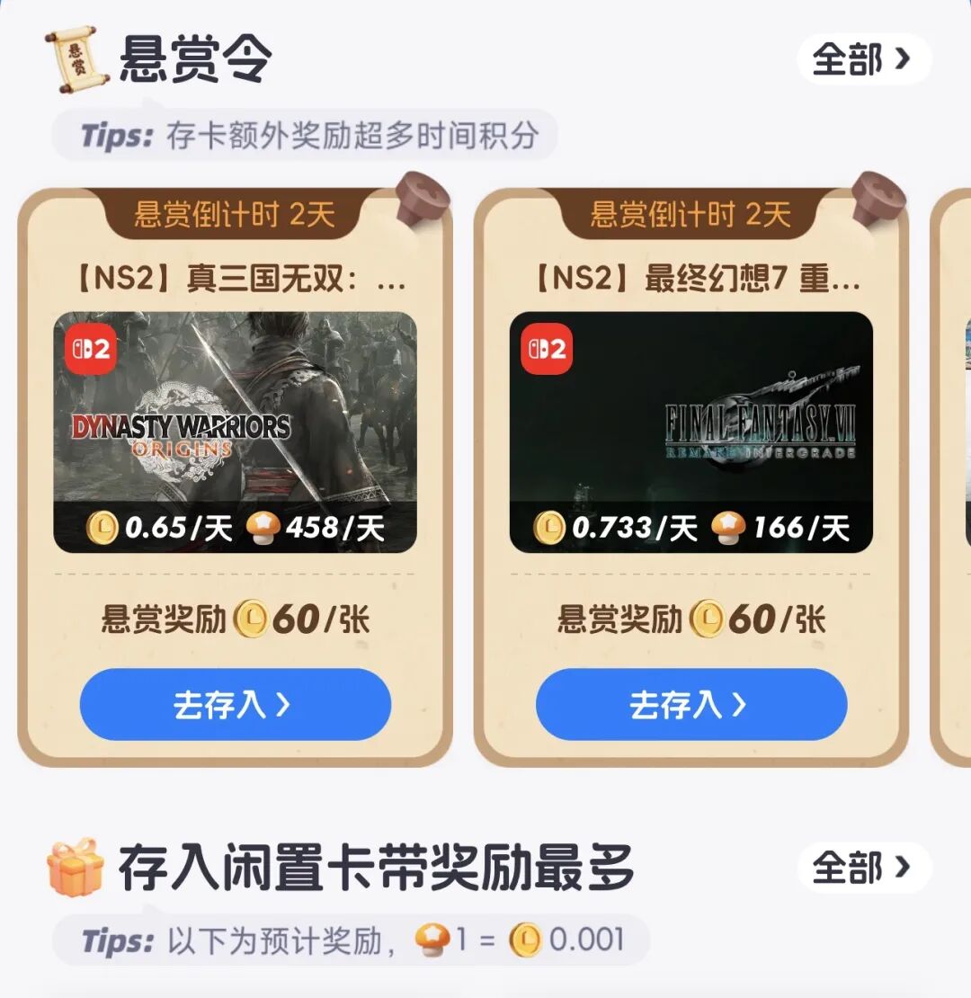 如果你手里已经有闲置卡带,蘑菇时间的「存卡换卡」是另一个省钱的姿势。把积灰的宝可梦、塞尔达存入平台,换成积分就能免费借其他游戏。